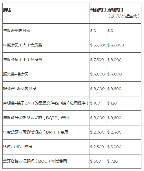 因此,Bluetooth SIG董事會于2021年3月9日 批準將所有會員費提高20%,并于2022年1月1日生效。費用結構的變更摘要可在下表中找到所有費用:USD $